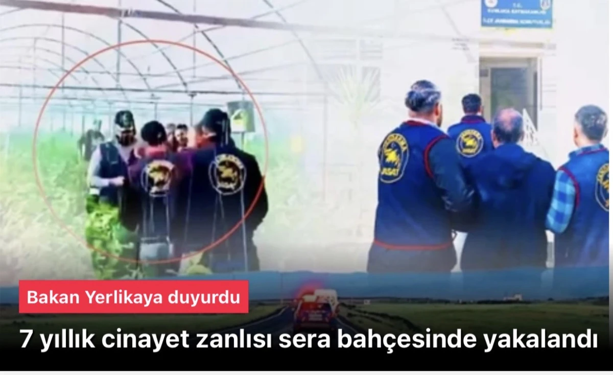İçişleri Bakanı Ali Yerlikaya, Diyarbakır’da 7 yıl önce işlediği cinayet sebebiyle 34 yıl kesinleşmiş hapis cezasıyla aranan M.T. isimli şüphelinin Antalya’nın Kumluca ilçesindeki sera bahçesinde JASAT tarafından yakalandığını duyurdu.